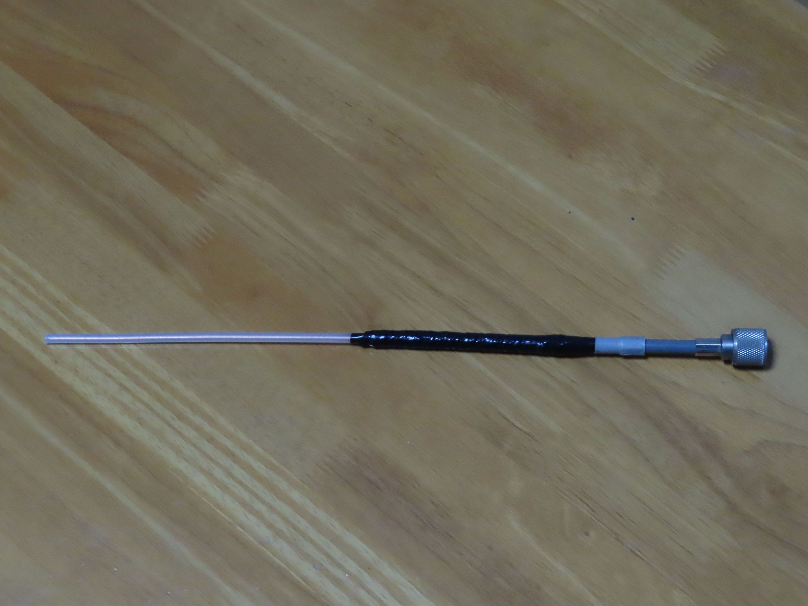 また、上記の条件でSWRが1.2くらいに落ちた状態でリグのアンテナ端子に直付けしてみるとSWR3以上のレッドゾーンです。基台に戻すと1.2を表示します。芯線のエレメントは17㎝にしましたが、そもそも共振しているのかも不明。